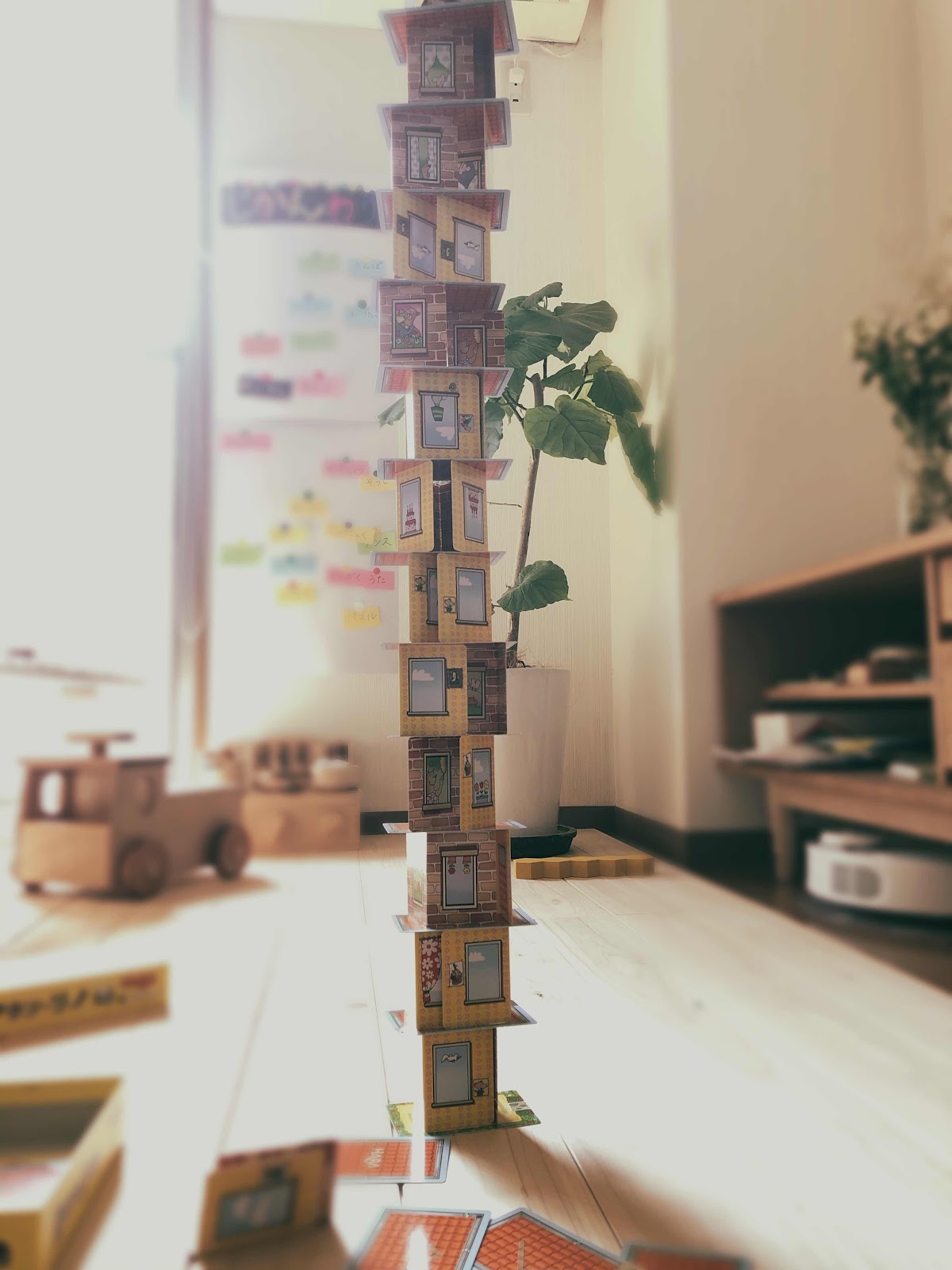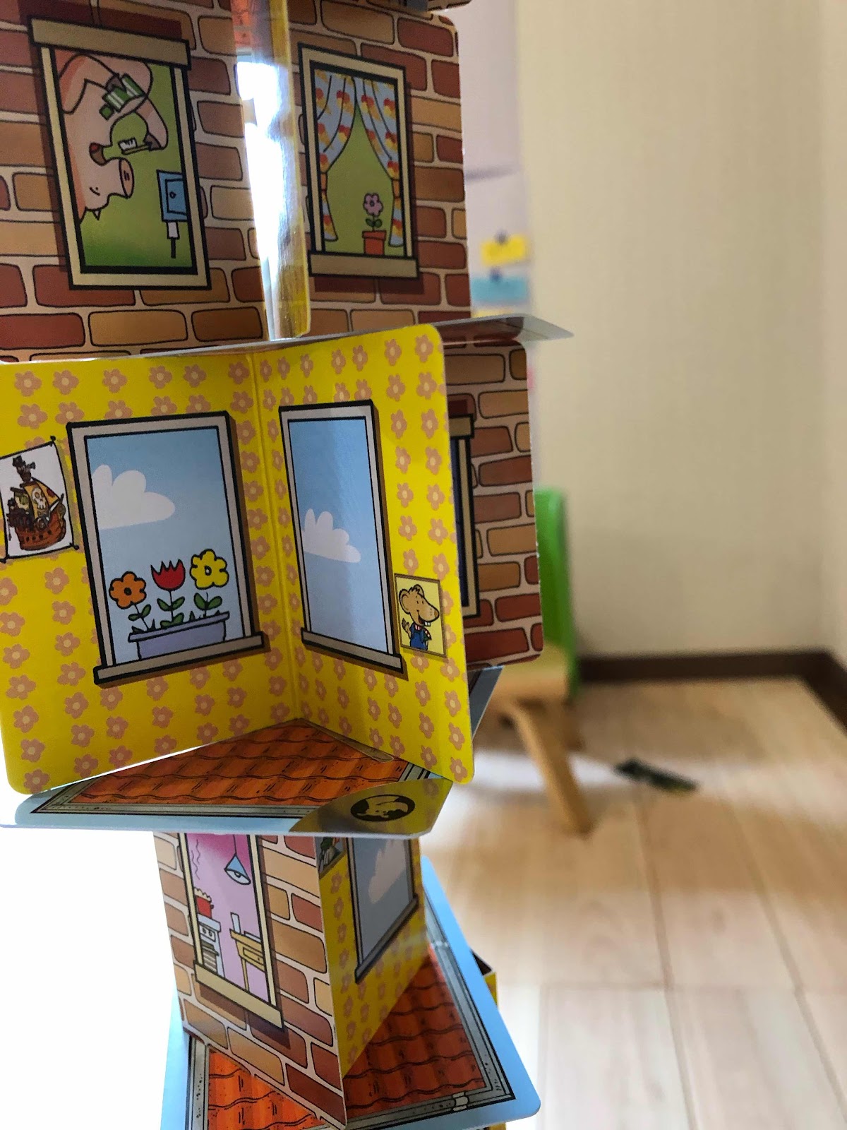 こちらは壁カード、屋根カードを積み上げていくゲーム。ジェンガのカード版といった感じです。