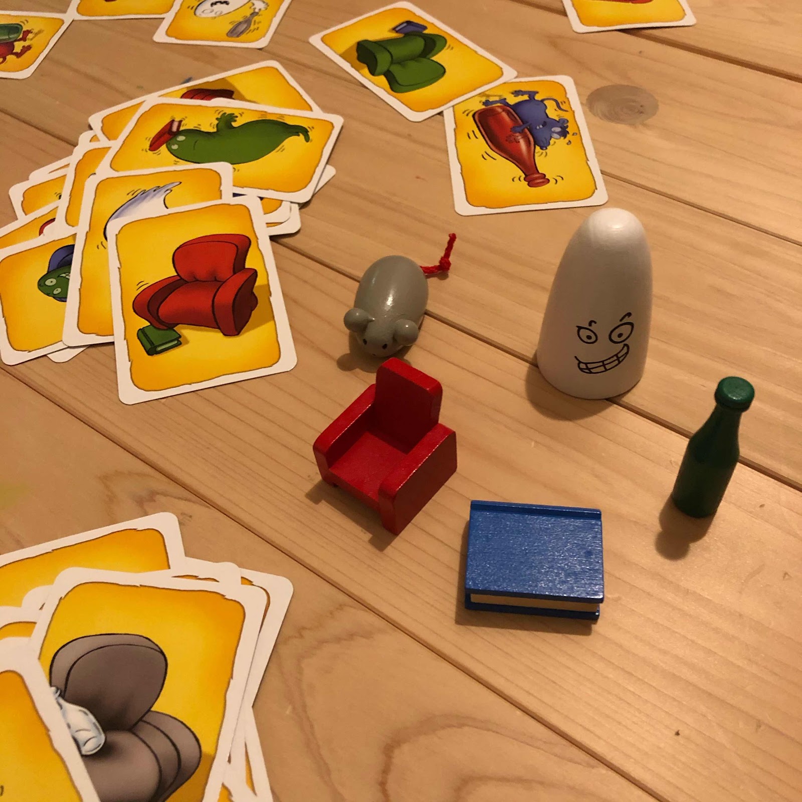 テーブルの中央に5つのコマを置きます。それは「白い-オバケ」「灰色の-ネズミ」「赤い-いす」「緑の-ボトル」「青い-本」です。