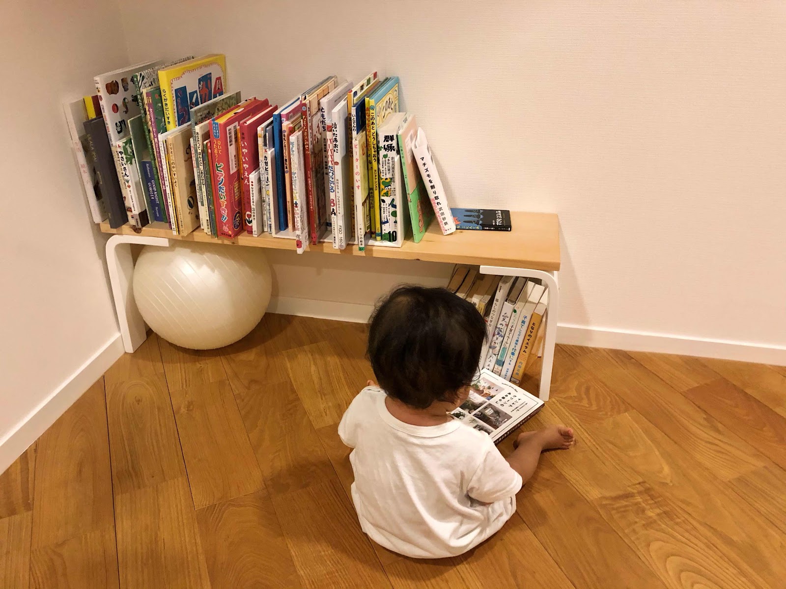 図書館で借りた本はリビングのこのスペースに置いています。大きめの本棚はフリールームに置いていますが、他にもリビング、寝室、キッチンカウンターの上など、いろんな場所に散らして置き、大人の本も子供の本もいつでも手に取れるようにしています。